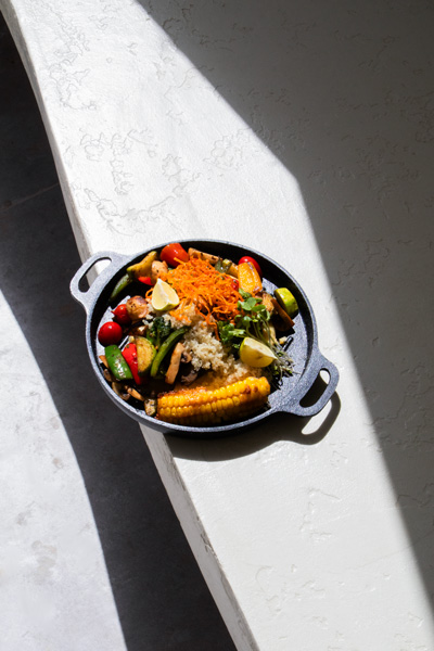 کاهو رومن + سینه مرغ + گوجه چری + پنیر کبابی + زیتون + پارمسان + سس سزار
