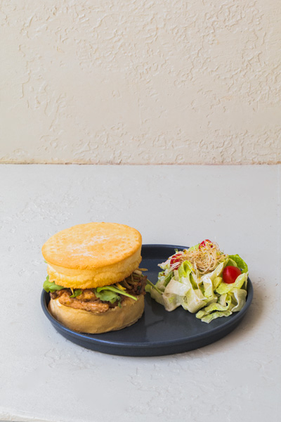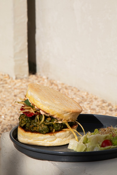 نان + سینه مرغ + گردو + پنیر مخصوص + سس پستو + سالاد