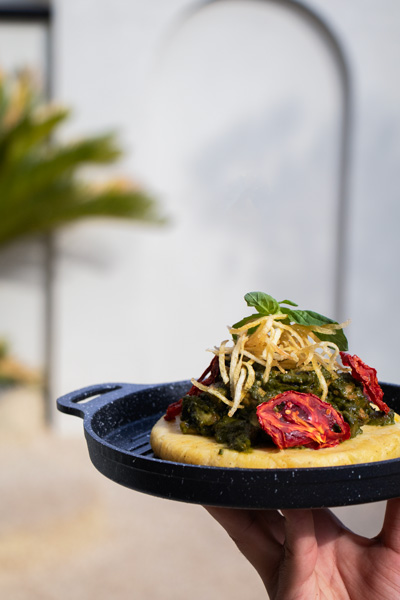 نان تست + پنیر مخصوص دوز + زیتون سیاه + ریحان ایتالیایی