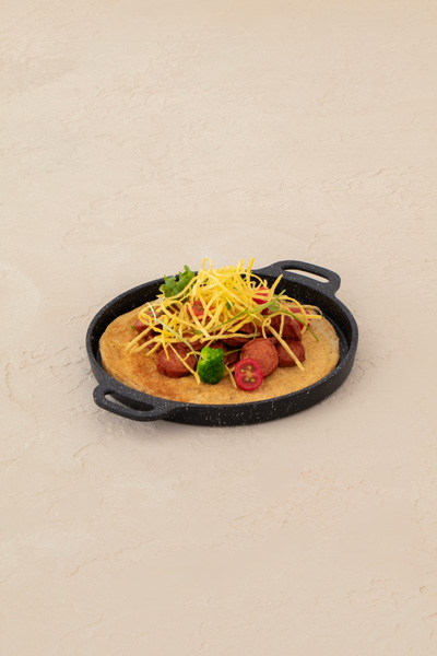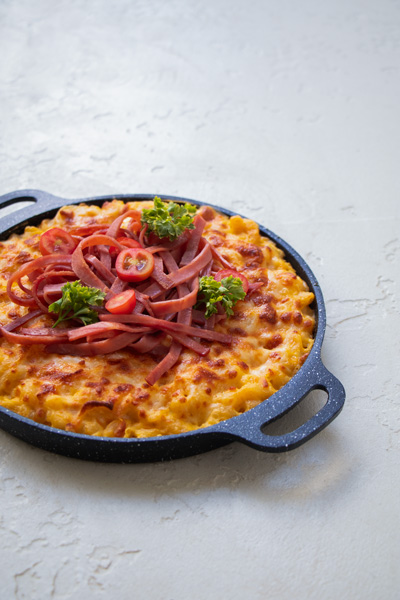 پاستا + پنیر چدار + پنیر موزارلا + بیکن